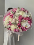 A refined composition built on soft movement and layered color. Plush hydrangeas create a smooth foundation while graceful orchids add a clean, sculptural touch. Silva Pink spray roses bring warmth and romance, complemented by the gentle fragrance of matthiola. The palette flows through blush, white and lilac shades, forming an airy, polished bouquet with an expressive character.