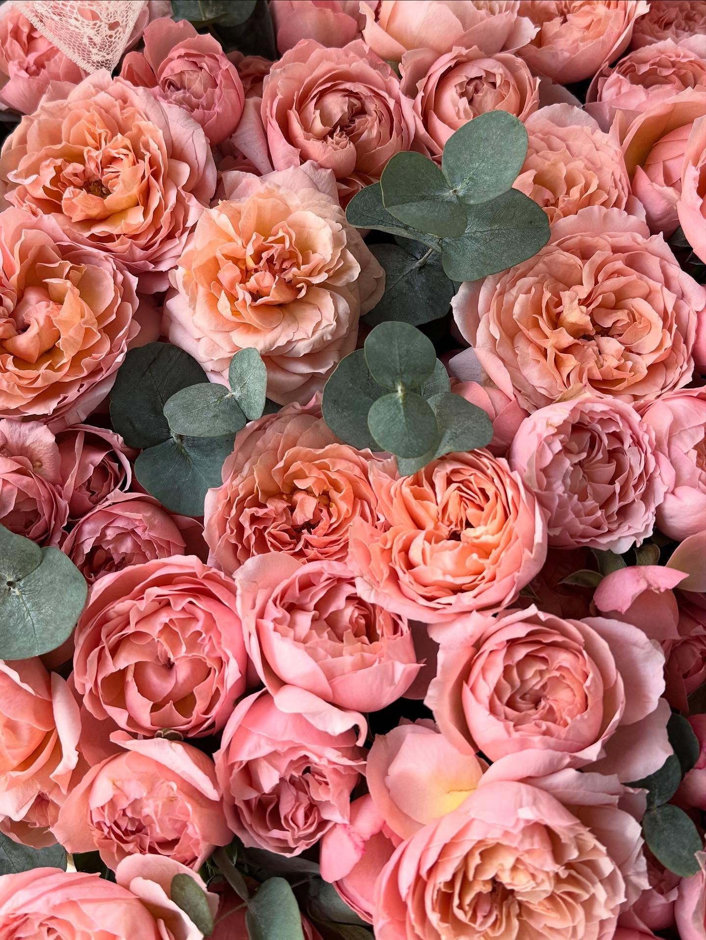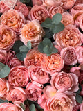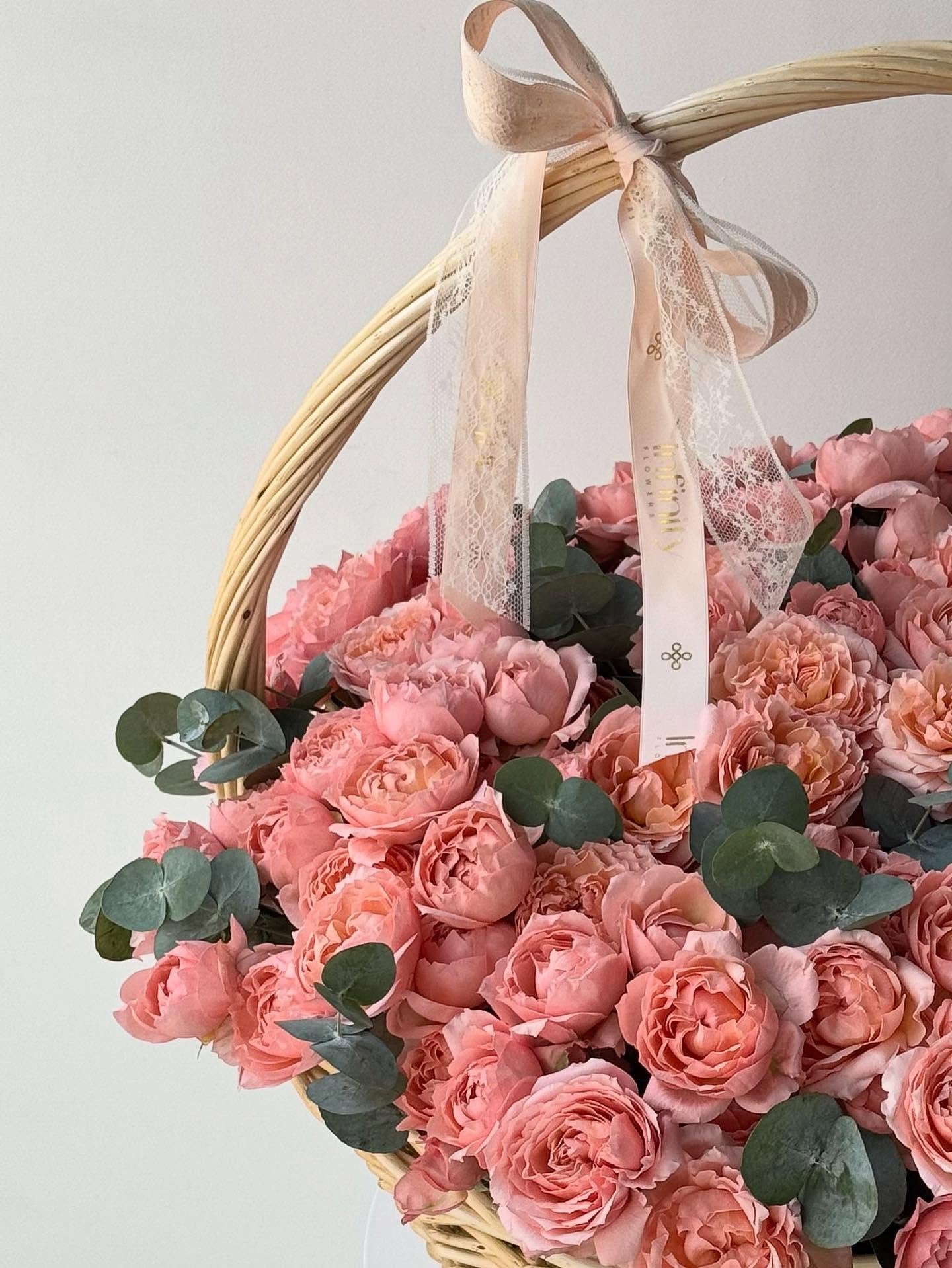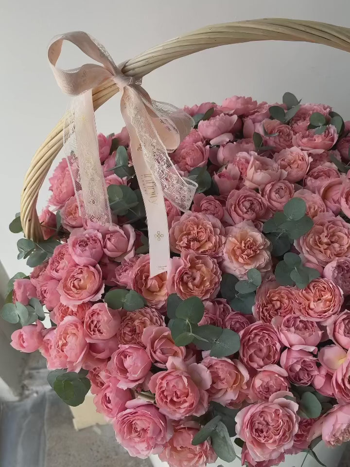 A lush, inviting basket filled with garden roses in gentle pink and peach tones. The flowers open beautifully against fresh greenery, creating a warm, romantic composition with a soft, joyful character. This design feels generous and elegant, making it an ideal choice for someone who deserves a truly heartfelt and beautiful gesture.