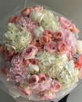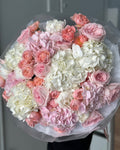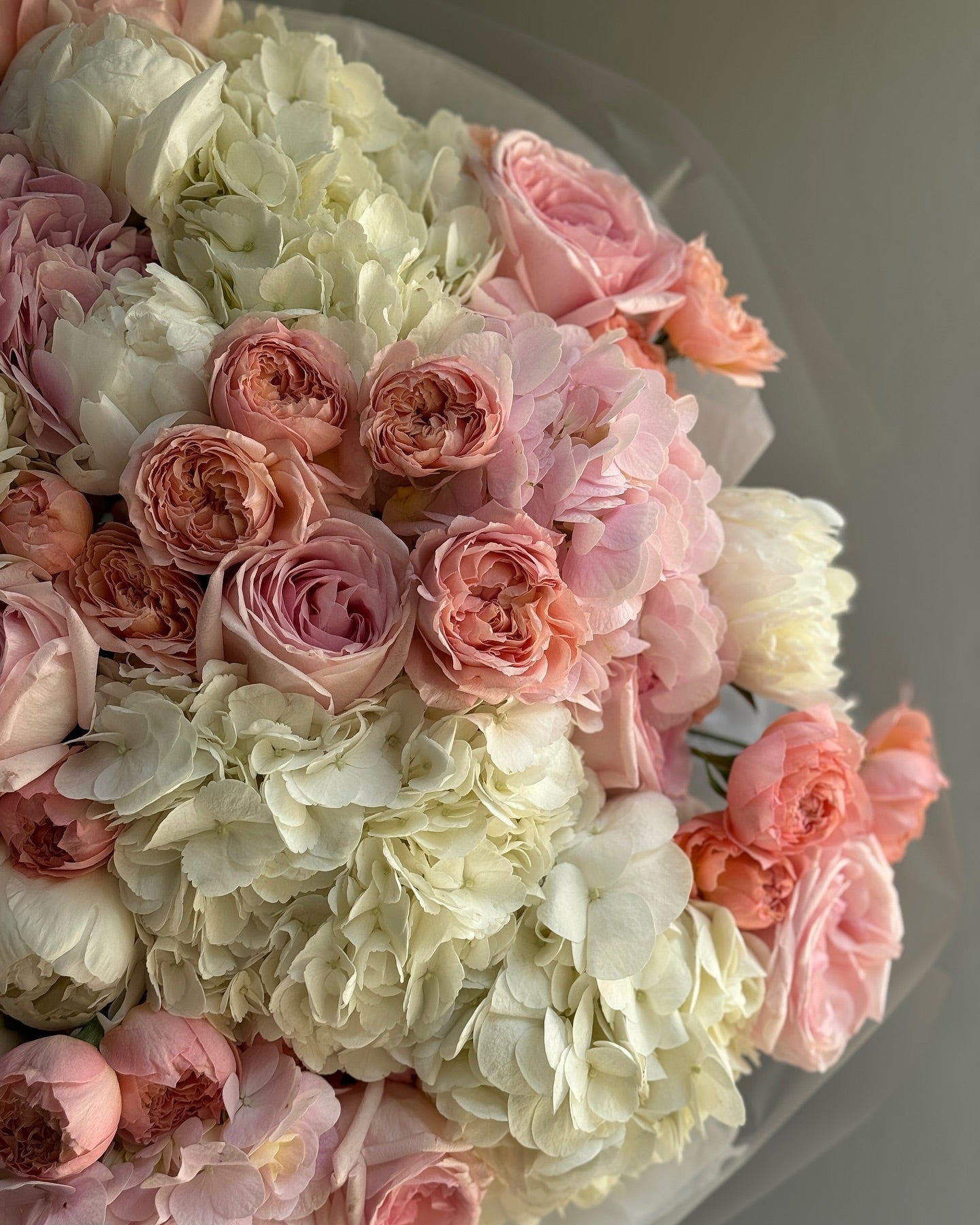 The “Jamila” bouquet blends softness and elegance in a refined composition of garden roses, and hydrangea. Carefully balanced textures and graceful blooms create a luxurious yet delicate arrangement, perfect for sophisticated gifting.
