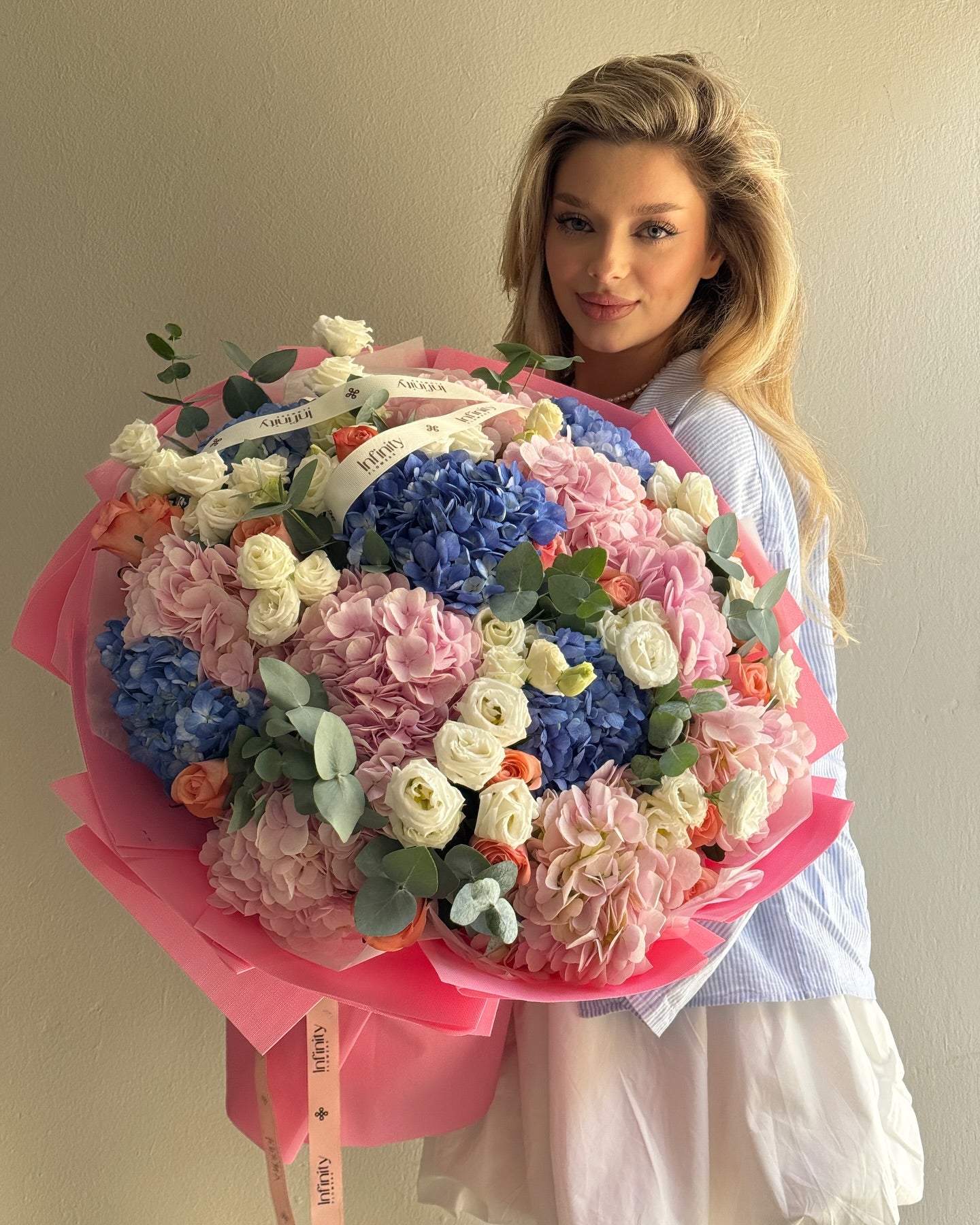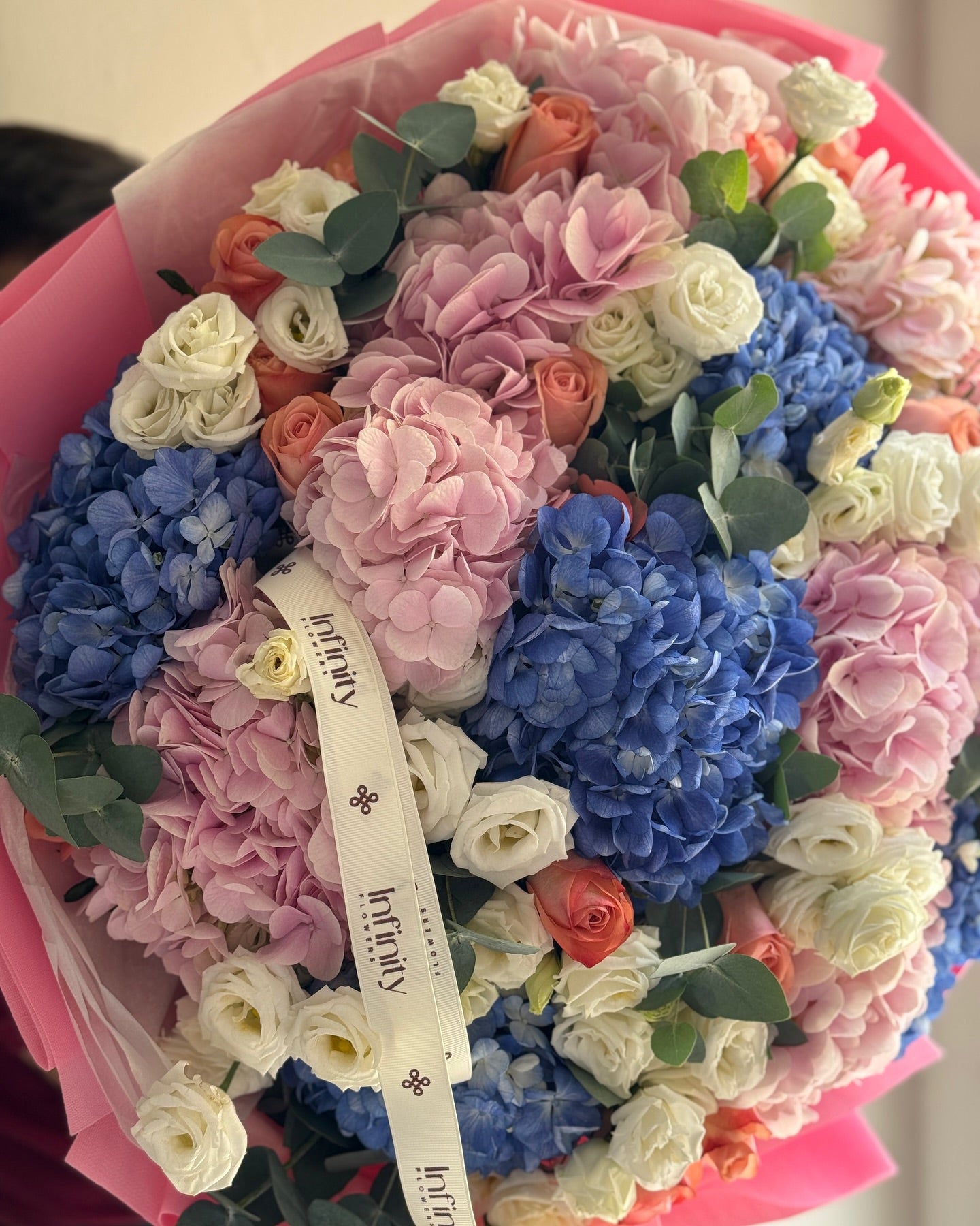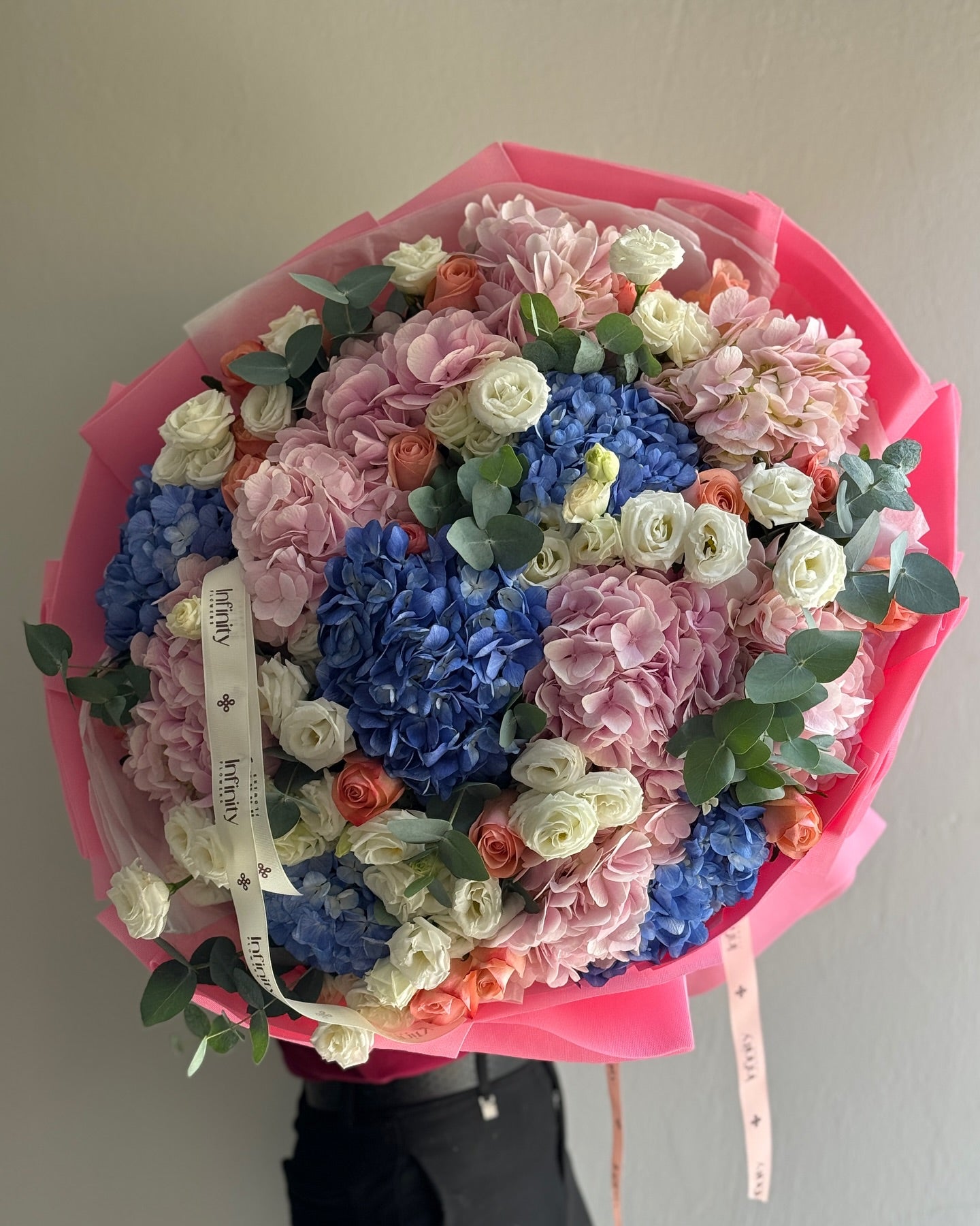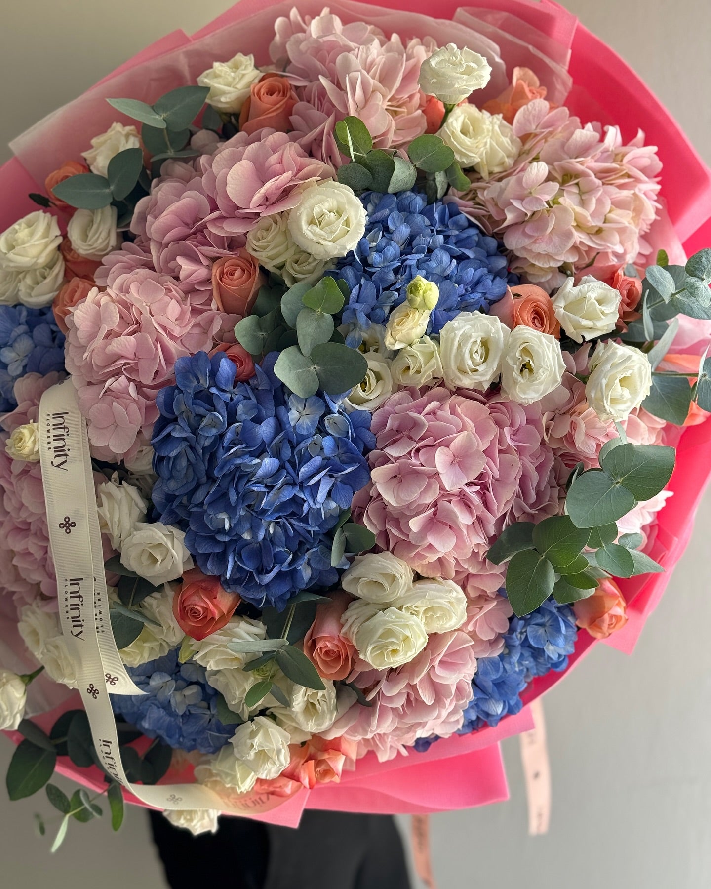 A fresh and expressive bouquet built around airy hydrangeas in soft pink and deep blue tones, complemented by delicate spray roses and eucalyptus greenery. The color palette feels light yet vibrant, creating a balanced composition with a refined, contemporary character.