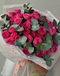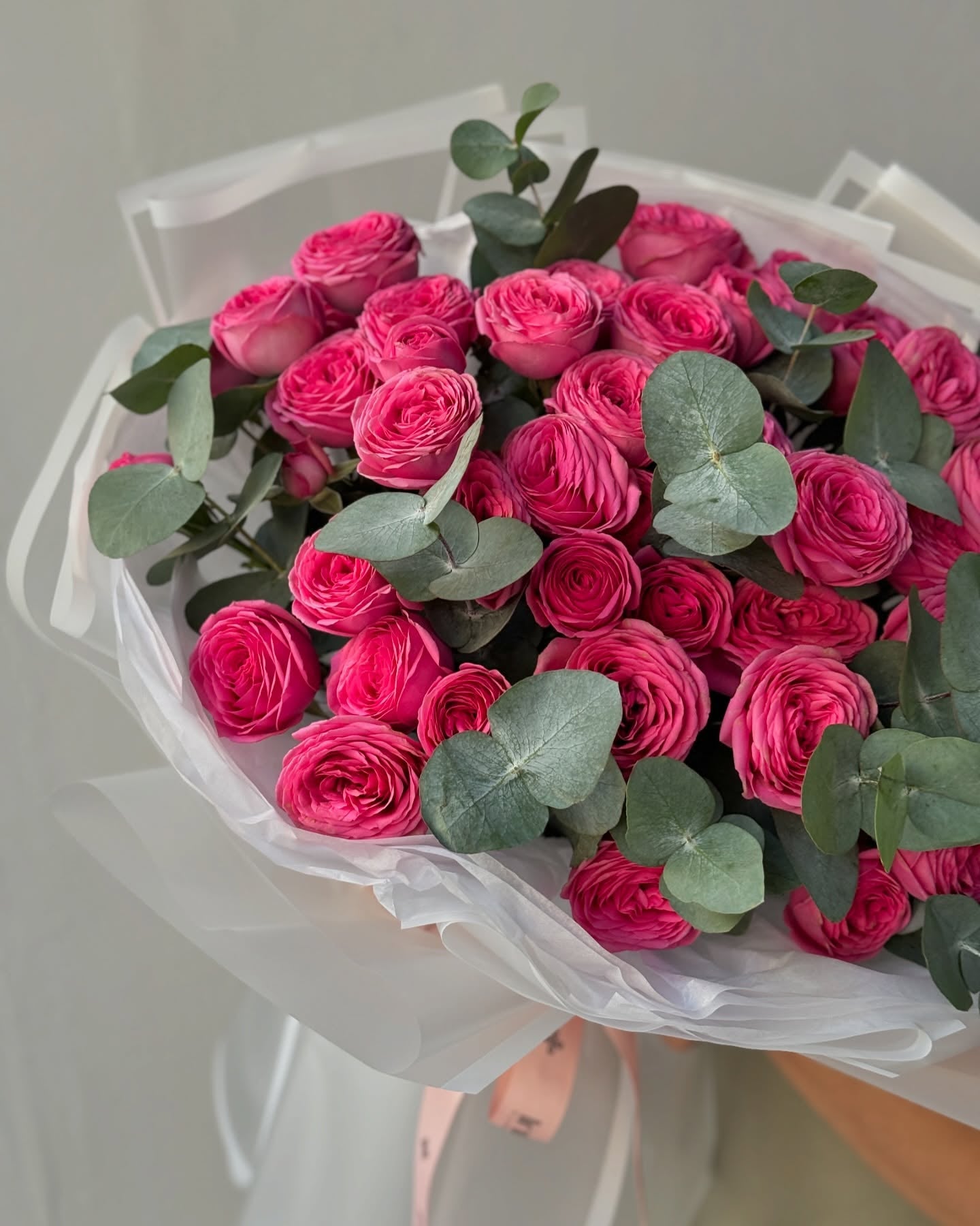 Vibrant hot pink peony spray roses steal the spotlight in this bold and energetic arrangement, each bloom showcasing incredible petal density and that signature spiraled form. Paired with fresh eucalyptus leaves that provide a stunning color contrast, these blooms radiate confidence and joy.