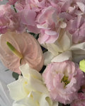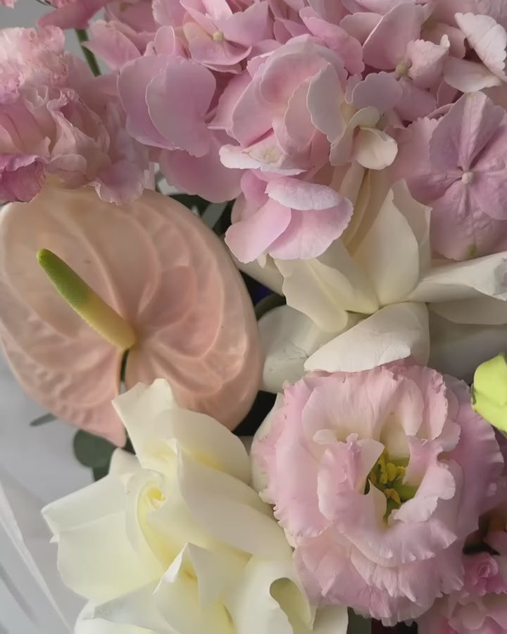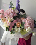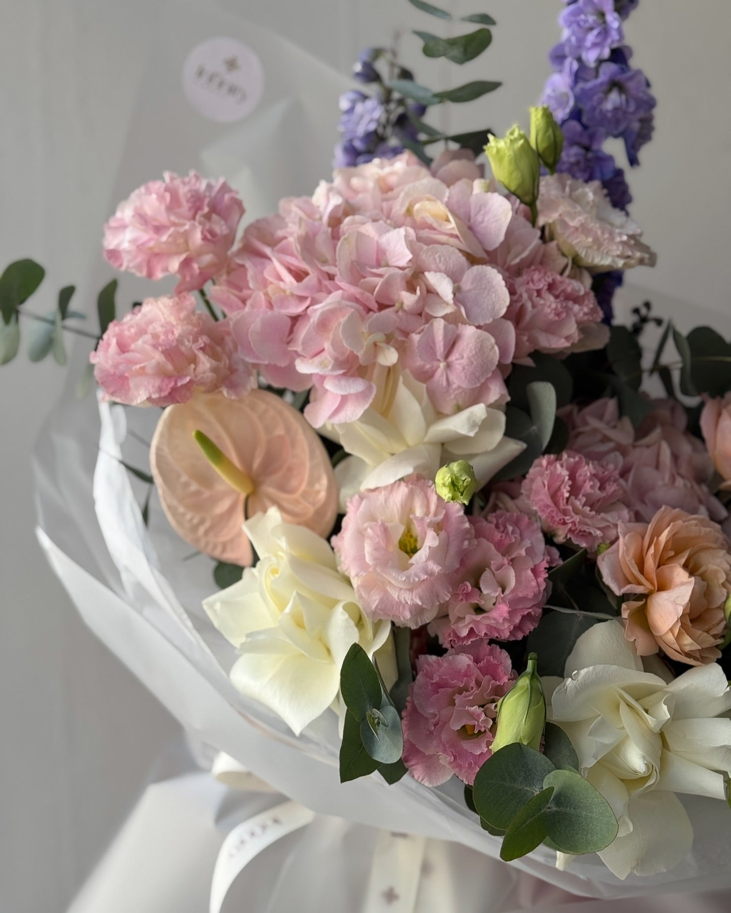 This showstopping arrangement brings together an exquisite medley of premium blooms in soft pastels and dramatic purples, creating a truly unforgettable visual experience. Featuring voluminous pink carnations, elegant white lisianthus, striking purple delphinium spikes, peachy garden roses, delicate anthurium, and fresh eucalyptus, each element contributes its unique texture and character.