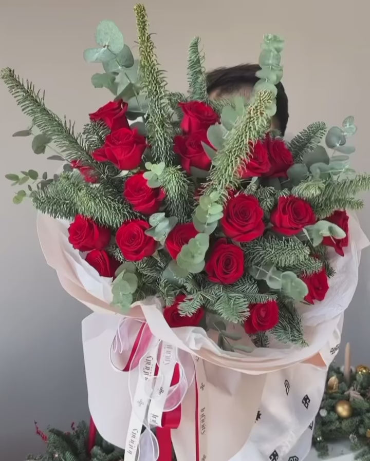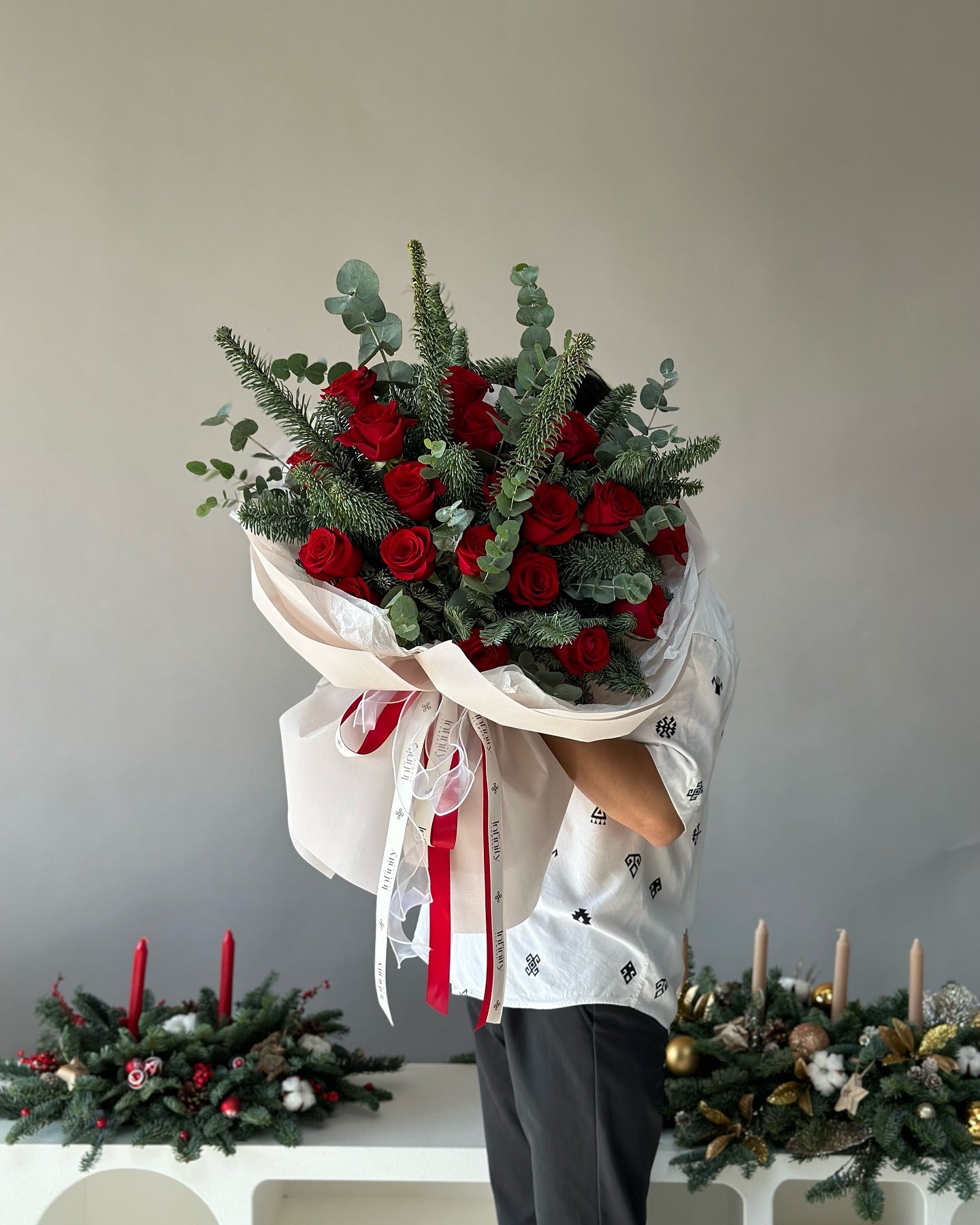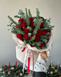 This festive arrangement pairs luxurious red roses with fresh nobilis fir branches and silvery eucalyptus, capturing the essence of the holiday season. Skillfully arranged by our Los Angeles team and wrapped in elegant white paper with red and cream ribbon accents, this Christmas-inspired design brings warmth and celebration to any gathering or makes a memorable seasonal gift.