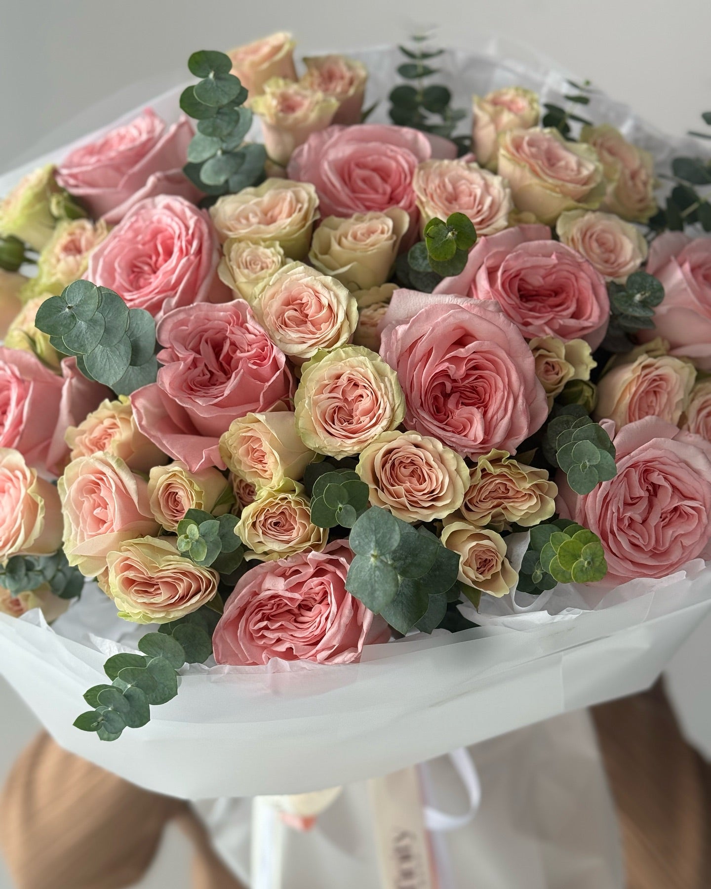 Soft blush peony-style roses and delicate spray blooms create a rich, painterly composition with graceful eucalyptus accents. Layered textures and gentle tones give this bouquet a refined, timeless character — elegant, expressive, and quietly captivating.