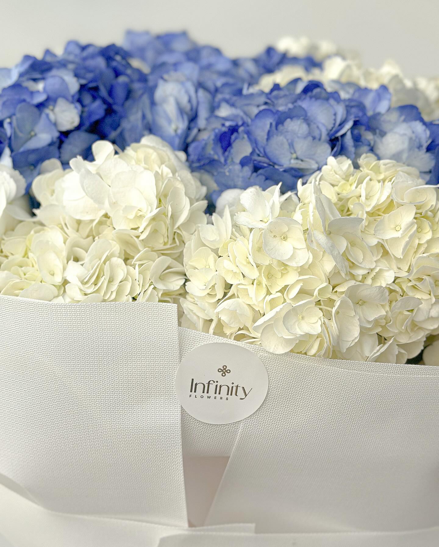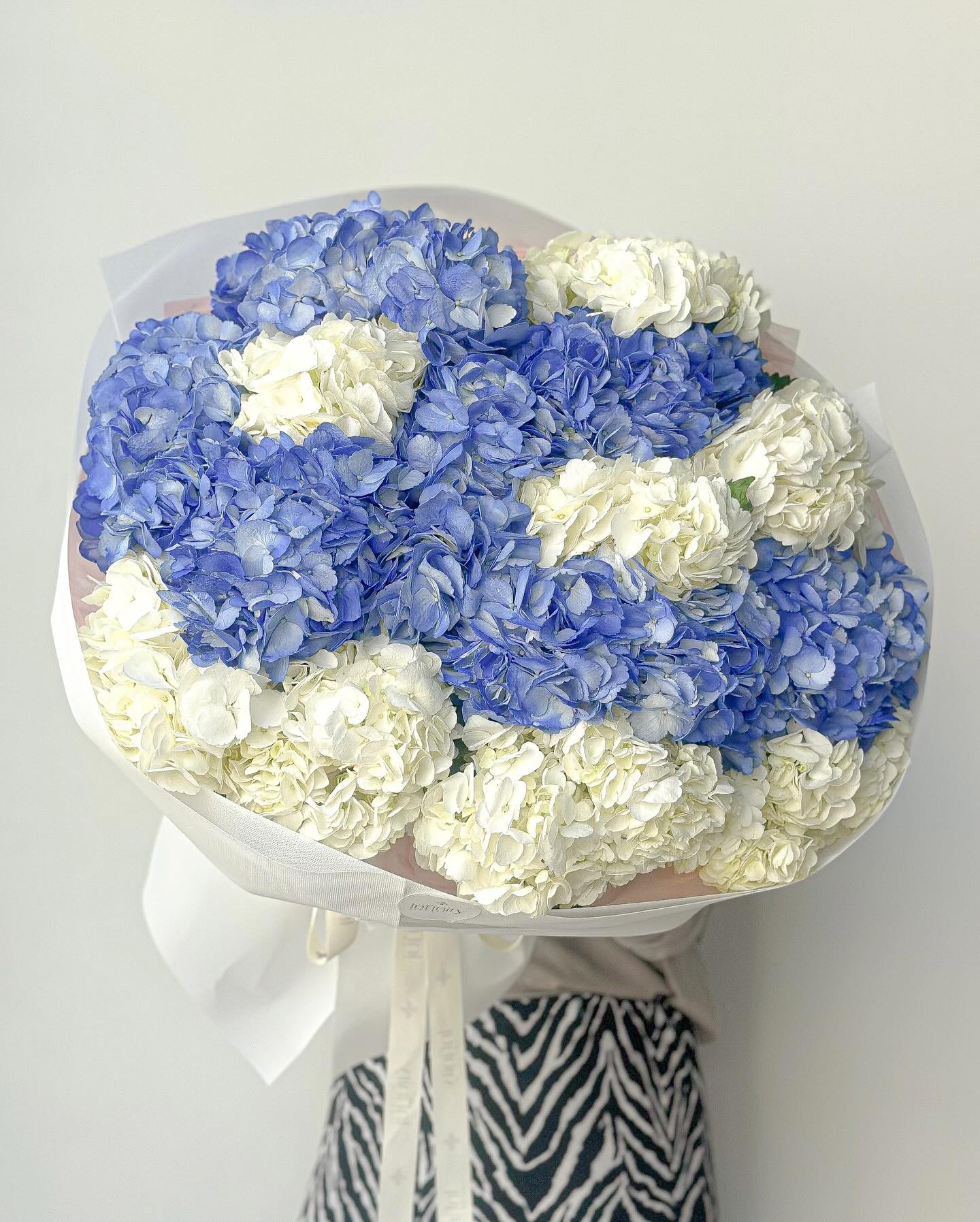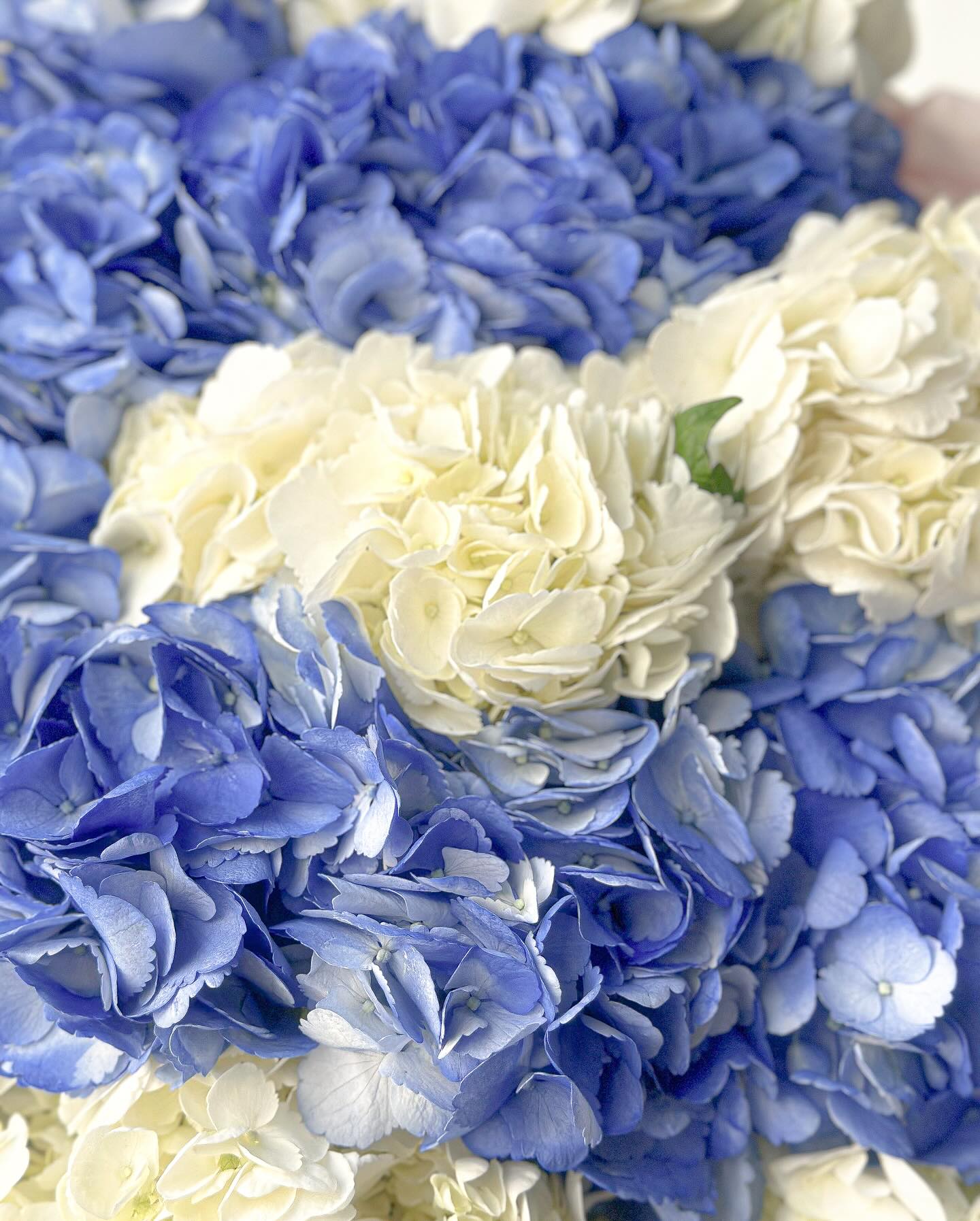 Airy volume and striking contrast define this arrangement of 15 lush hydrangeas. Soft, cloud-like blooms in blue and white create a fresh, modern presence with a light, luxurious feel. A perfect choice when you want something eye-catching yet effortlessly elegant.