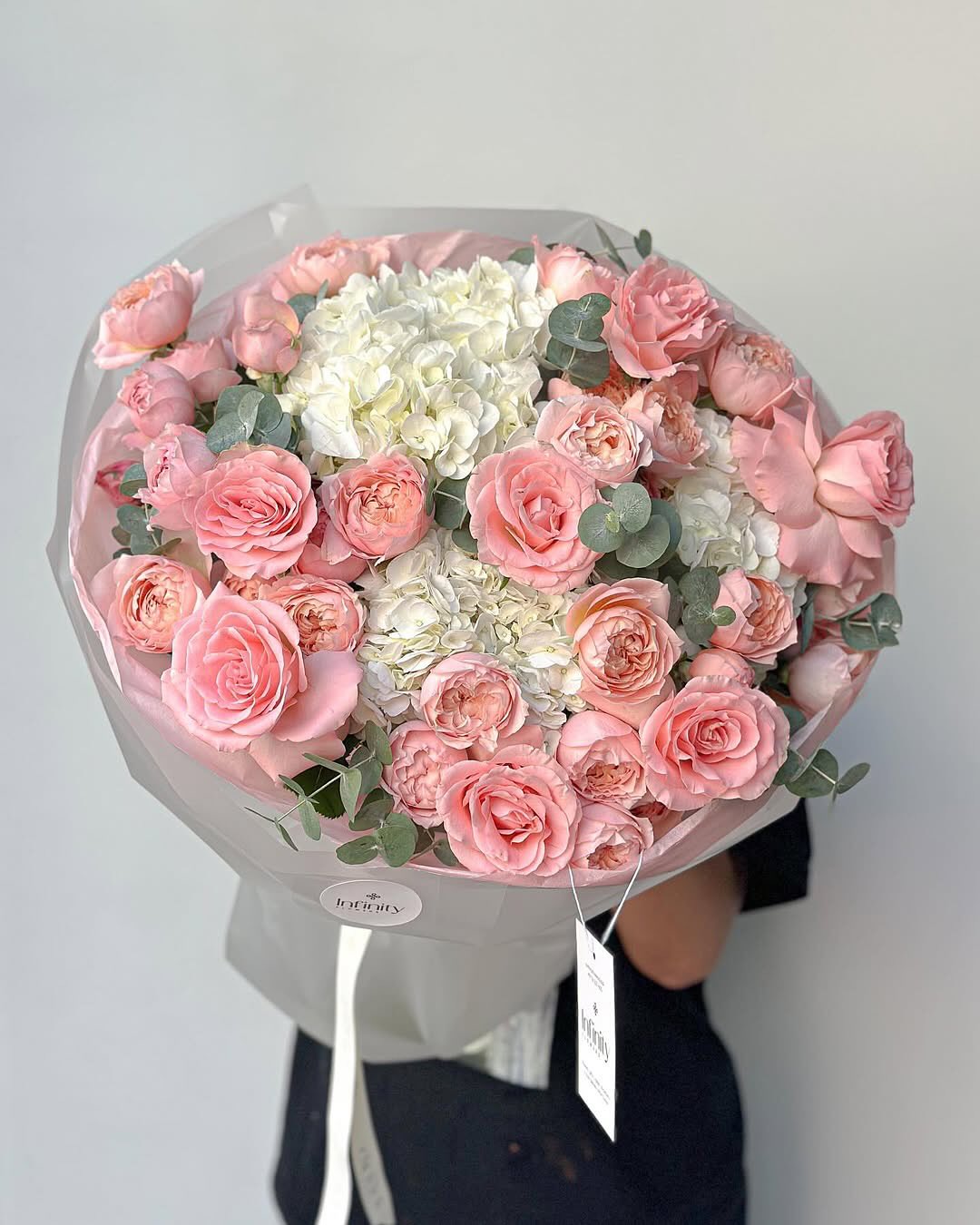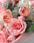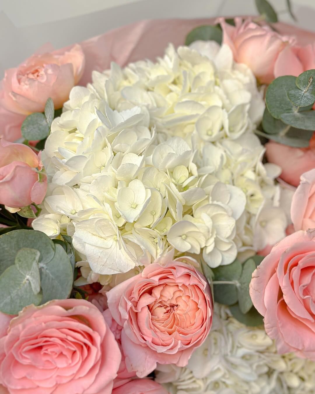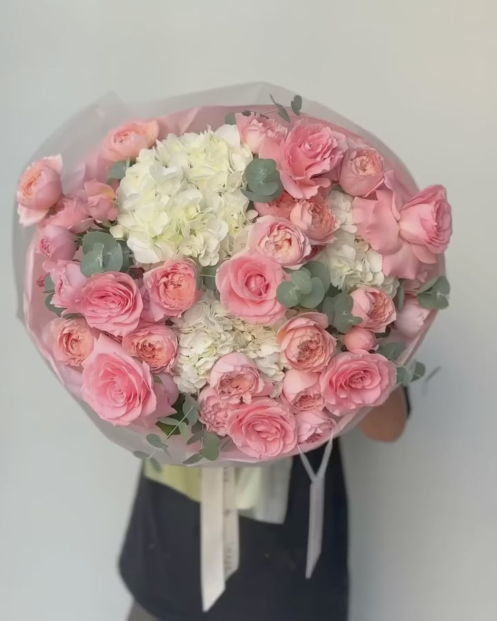 Soft light and gentle textures shape this romantic arrangement, where hydrangeas, peonies, creamy roses, lisianthus, and eucalyptus come together in perfect harmony. Airy, calm, and effortlessly beautiful, it’s the kind of bouquet that invites you to slow down and simply feel the moment.