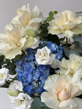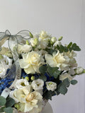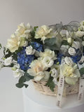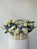 Cream roses, snow-white lisianthus, and deep blue hydrangeas come together in a refined basket arrangement softened with eucalyptus. Calm, balanced, and effortlessly elegant, this composition feels serene yet expressive. A sophisticated choice for meaningful moments when emotions are best conveyed without words.