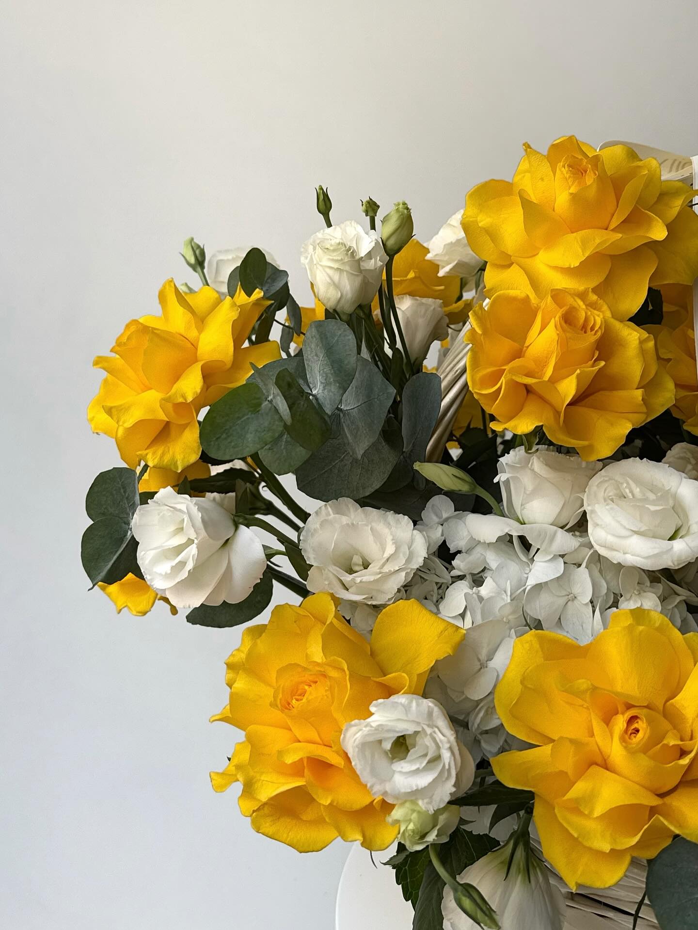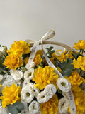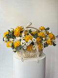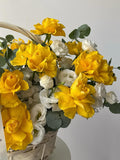 Sun-washed tones and natural textures define this basket arrangement of yellow roses, white lisianthus, and fresh eucalyptus. Cheerful yet graceful, it carries the feeling of warmth, optimism, and quiet sophistication — like early sunlight filling the room and setting the mood for a beautiful day.