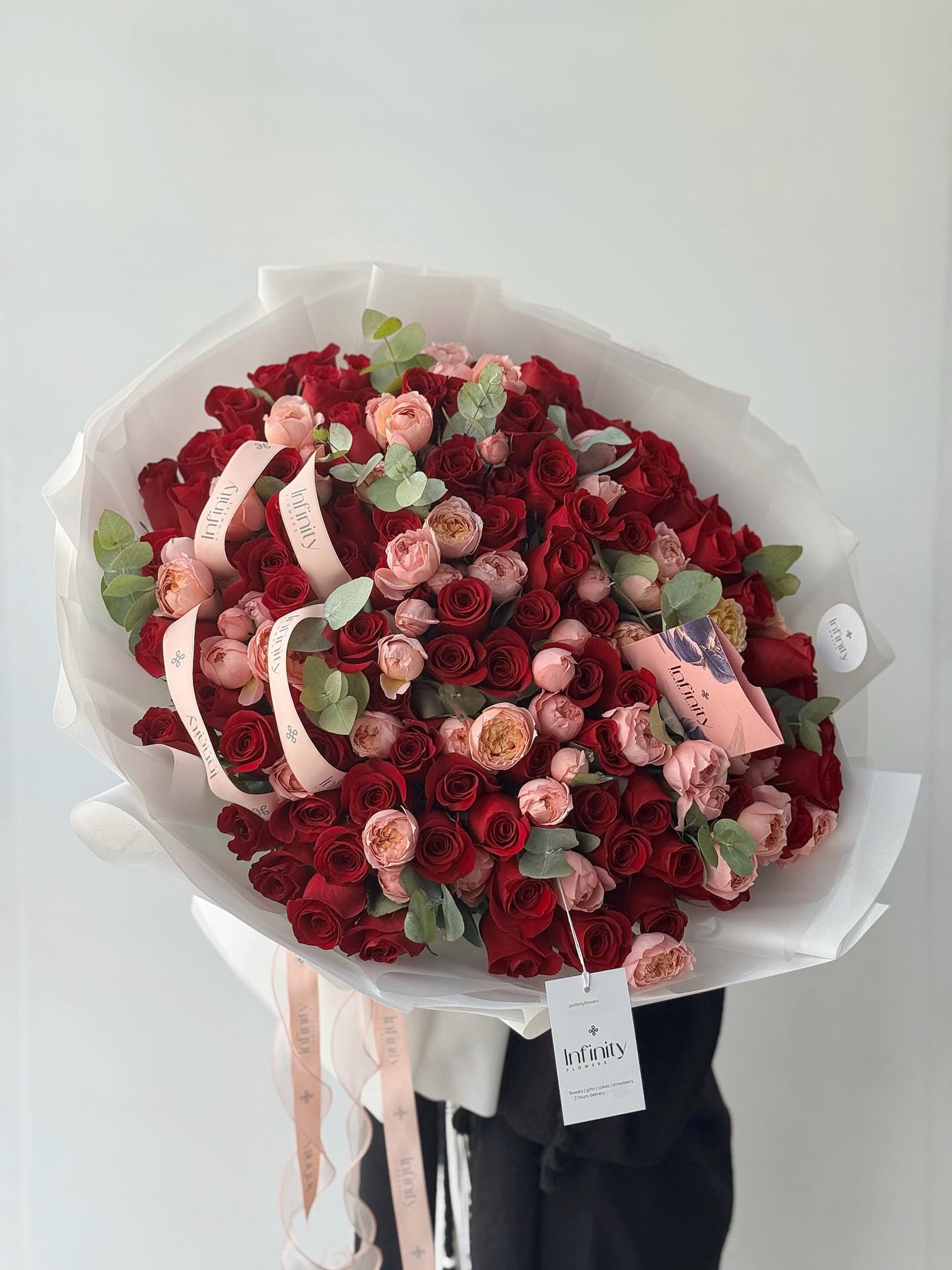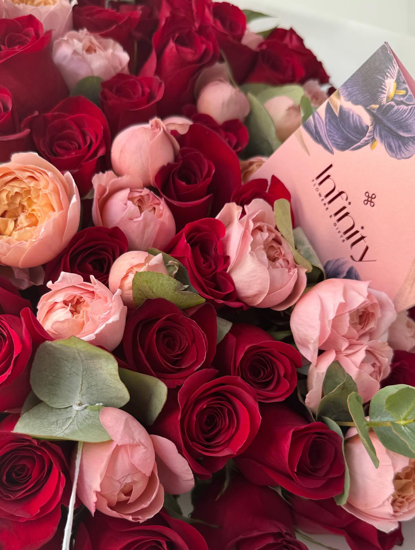 Deep red and soft blush roses come together in an opulent, full-bodied arrangement designed to captivate at first glance. Rich textures and romantic tones create a powerful yet elegant presence — timeless, expressive, and made to declare love without saying a word.