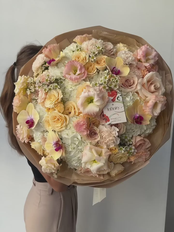 This bouquet feels warm and inviting from the very first look. Creamy whites, blush pinks, and gentle peach tones come together in a balanced, elegant mix that feels natural, calm, and quietly romantic. It’s the kind of arrangement that works beautifully for refined flower gifting, special occasions, or simply sending something truly thoughtful and memorable.