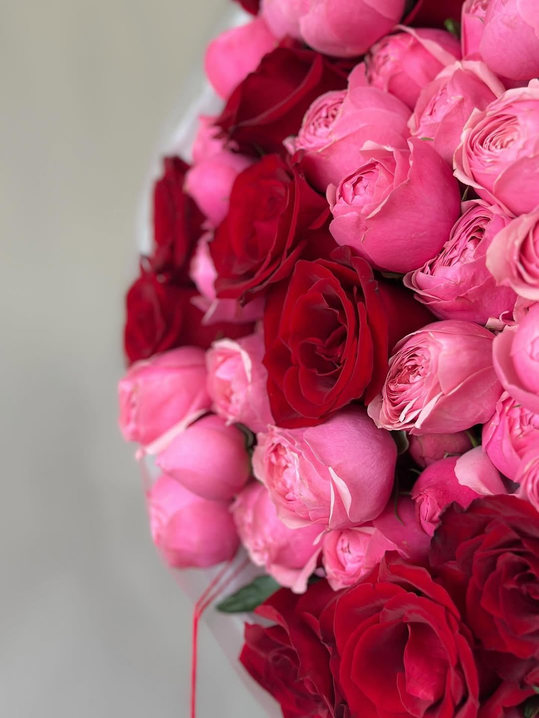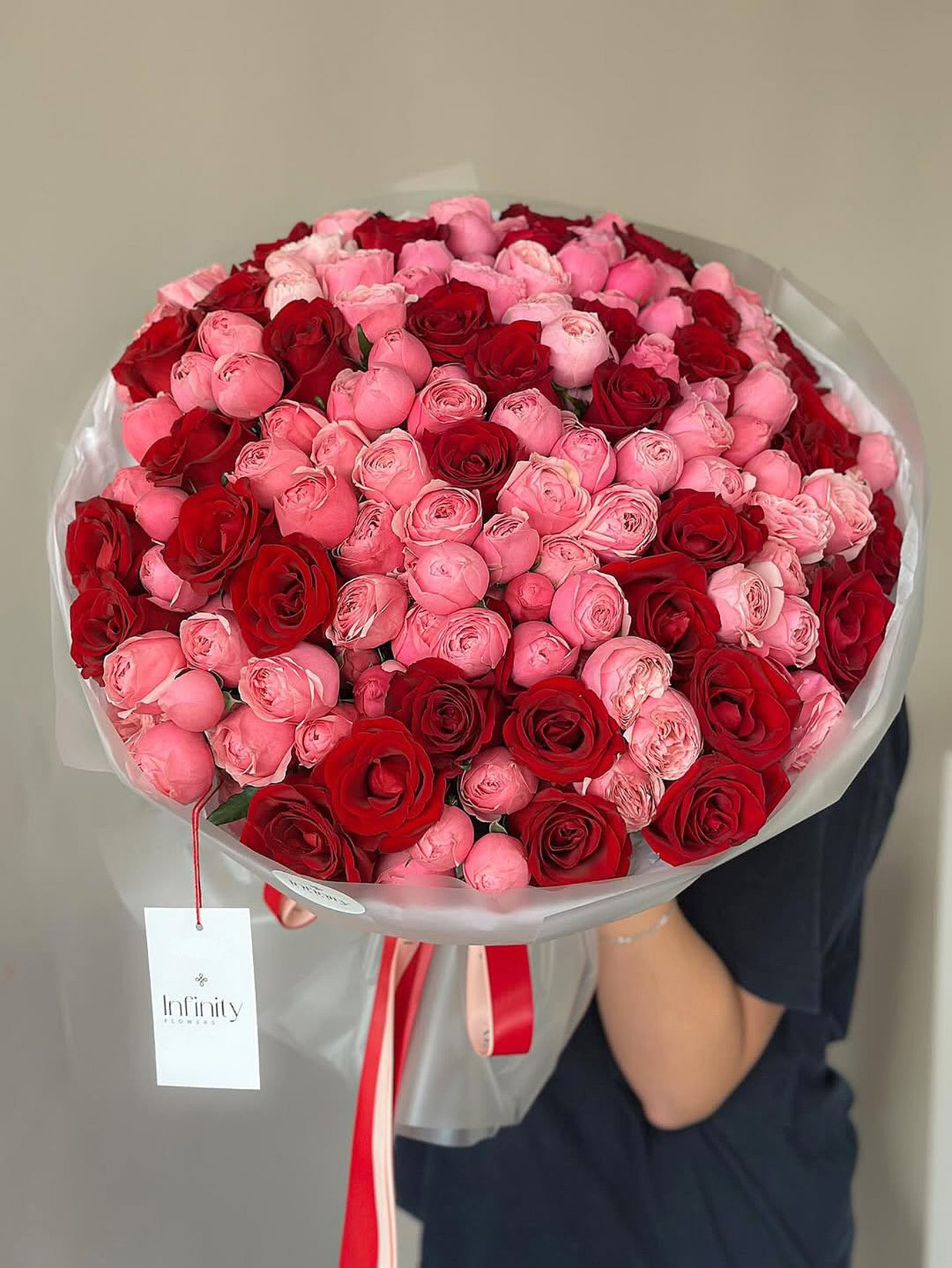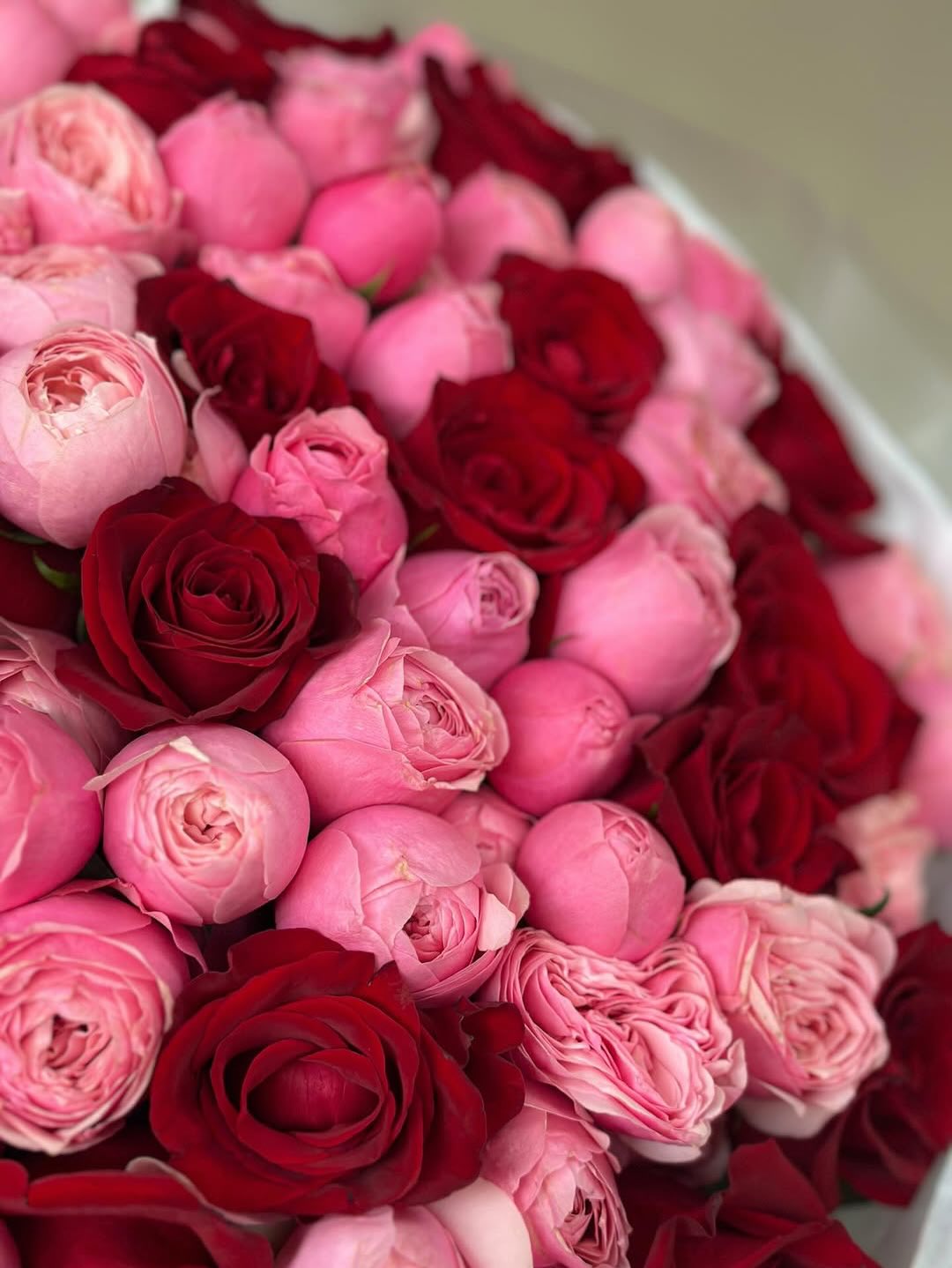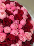 A luxurious oversized bouquet combining deep red roses with soft blush pink garden roses. Rich, romantic, and perfectly balanced, this arrangement symbolizes passion and tenderness in one powerful gesture — ideal for anniversaries, declarations of love, and unforgettable moments.