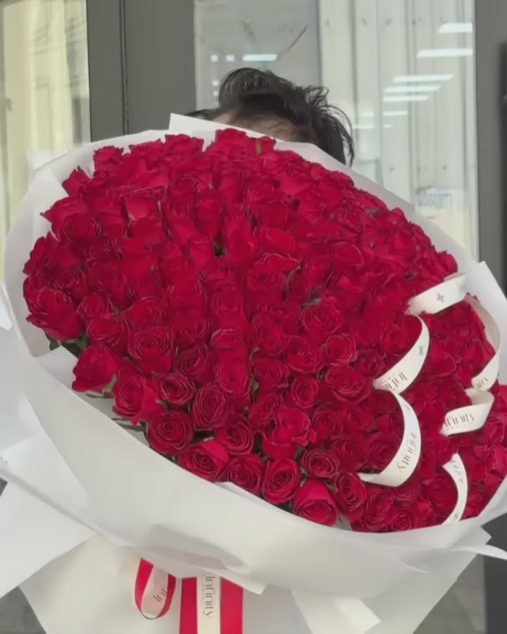 Nothing speaks romance like this stunning collection of deep red blooms. Each premium long-stemmed variety showcases perfect petal formation and rich color saturation, creating an unforgettable visual impact. Wrapped in pristine white paper with signature ribbon detailing, this magnificent gesture represents the ultimate expression of love and devotion.